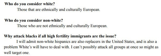 In his world, whites are ‘his team’ and non-whites are ‘the enemy’. Perhaps if he hadn’t been 100% introverted he could have actually talked to some real people and understood that many (and probably most) white people find his views abhorrent. Perhaps he could have talked to people belonging to minority groups and found common ground with them (something OTHER than hating Jews, please!)