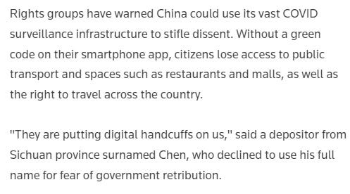 Last April, Chinese banks unexpectedly froze the accounts of numerous customers without a plausible explanation. Recently, would-be protestors trying to get their money back found their digital covid health apps ‘red’, meaning they lose access to nearly all public services.