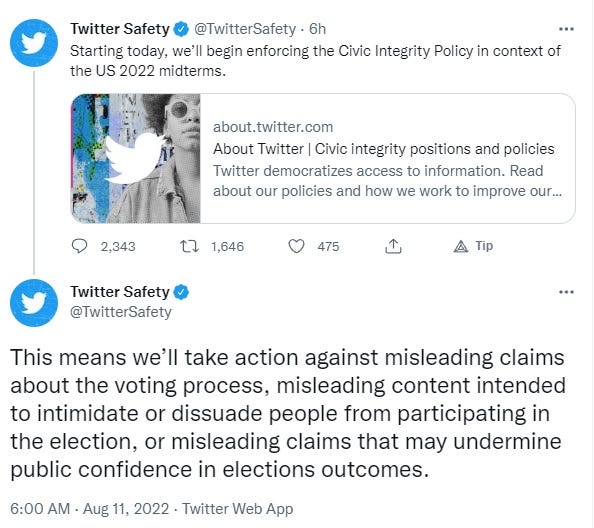 Not since the glorious implosion of the Disinformation Governance Board (or maybe CNN+) has something failed so quickly and spectacularly. Is Twitter going to censor these people who are obviously ‘undermining public confidence in elections’? Of course not. They know it. You know that they know it. They know that you know that they know it. But at this point it’s too late to do anything but attempt to control everything even HARDER, with predictable results. More people will shut off the TV. More people will leave Twitter, and the people who stay will speak up more often. More people will find Substack. All of these things are a problem for the controlmongers, who find themselves stretched increasingly thin.