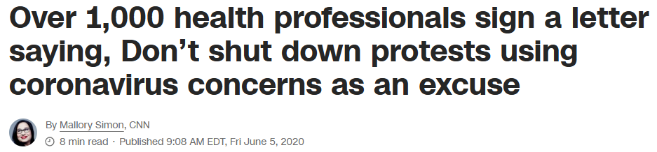 “However, as public health advocates, we do not condemn these gatherings as risky for COVID-19 transmission. We support them as vital to the national public health and to the threatened health specifically of Black people in the United States. We can show that support by facilitating safest protesting practices without detracting from demonstrators’ ability to gather and demand change. This should not be confused with a permissive stance on all gatherings, particularly protests against stay-home orders.”