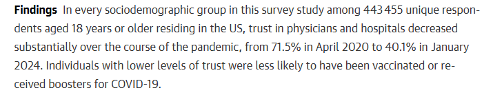 And because people who knew the truth so rarely spoke up (no doubt cowed by the examples made of people who did), the doctors used to persuade people to “trust the experts” lost that trust right alongside the public health agencies and the media. What else did we expect?