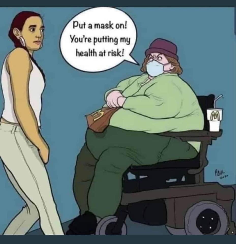 Eventually, they just settled on “My mask protects YOU, your mask protects me” (or, just as often “shut up and wear the mask”), which provided the perfect moral justification for Karen to get up in your face because you didn’t have an old T-shirt strapped to your face.