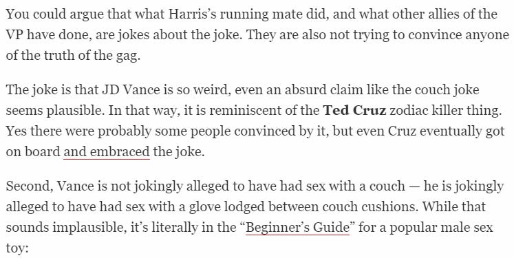 OK, the entire thing is a total lie, but it’s not like anybody ACTUALLY BELIEVED JD Vance had sex with a couch — you just don’t GET IT.