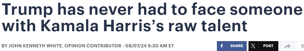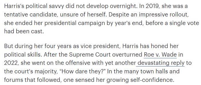 “Kamala Harris has raw political talent” is a line so detached from reality it’s a wonder Mr. White didn’t commit seppuku to restore his family’s honor. This pair of paragraphs, in particular, jumped out at me: