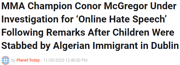 So after running this stabbing story through the “oppressor/oppressed” filter, in this case the media is forced to run cover for somebody who literally stabbed children — and attack those who are upset about the stabbed children…..even Conor McGregor: