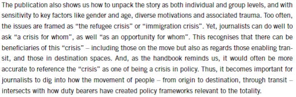 The answer — as usual — is “follow the money.” In this case, the money leads to The United Nations Educational, Scientific and Cultural Organization (UNESCO), which publishes a “helpful” 319-page informational booklet titled “Reporting on Migrants and Refugees.” This document is intended for journalism educators, and contains (among other things) this passage specifically recommending running stories through “the filter.” It’s not an “immigration crisis”, it’s “an opportunity”: