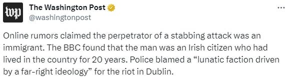 Indeed, it seems like the entire legacy media hyped up the ‘rumors’ — I was unable to find a single ‘respectable’ source that actually admits the perpetrator of the stabbing was an immigrant. (Can’t have those ‘far-right rumors’ being classified as ‘fact’, can we?)