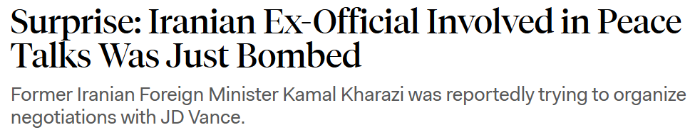 Kharazi was gravely injured and his wife was killed in the attack. So far I’ve seen no official word on who actually carried out the strikes, but blowing up the people trying to negotiate with you is a terrible way to bring about an end to the war. I have to believe at least some of the parties involved know this, which is exactly why “we” keep targeting negotiators. (Both Iran and Israel seem perfectly happy to continue this war forever, making me wonder how exactly we’re going to stop them from continuing.)