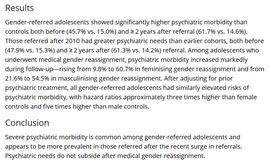 From the outside, this seems EXTREMELY obvious because the medical profession has been treating gender reassignment as some magical cure-all that fixes a problem that isn’t even physical. When the reality of the situation sets in after gender reassignment, patients are EVEN MORE likely to have mental issues. (Extreme buyer’s remorse.)
