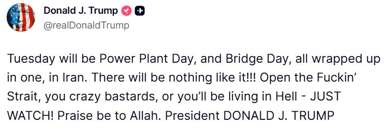 This is not the way. Iran doesn’t care about cussing on social media, and if they were going to submit because of Trump’s tough talk, they would have done it already. Trump’s just drawing a bright red line in the sand that Iran’s going to ignore — “forcing” Trump into attack Iranian infrastructure. (Winning so many hearts and minds!)