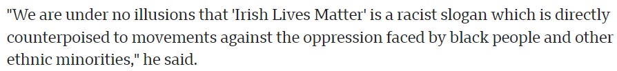 Isn’t calling the Irish people a bunch of racists inciting hatred against an ethnic minority? Arrest Gerry Carroll! (Who just happens to be a BLM supporter — and was himself investigated himself for hate speech. Luckily for him, ignorance IS an excuse!)