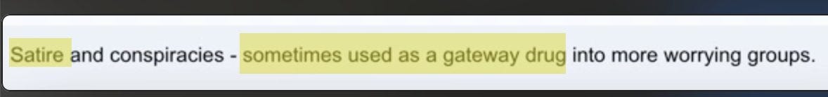Terp’s view of “disinformation” was overtly political. “Most misinformation is actually true,” noted Terp in the 2019 podcast, “but set in the wrong context.” Terp is an eloquent explainer of the strategy of using “anti-disinformation” efforts to conduct influence operations. “You're not trying to get people to believe lies most of the time. Most of the time, you're trying to change their belief sets. And in fact, really, uh, deeper than that, you're trying to change, to shift their internal narratives… the set of stories that are your baseline for your culture. So that might be the baseline for your culture as an American.”