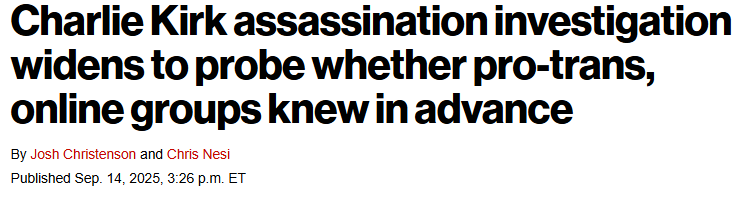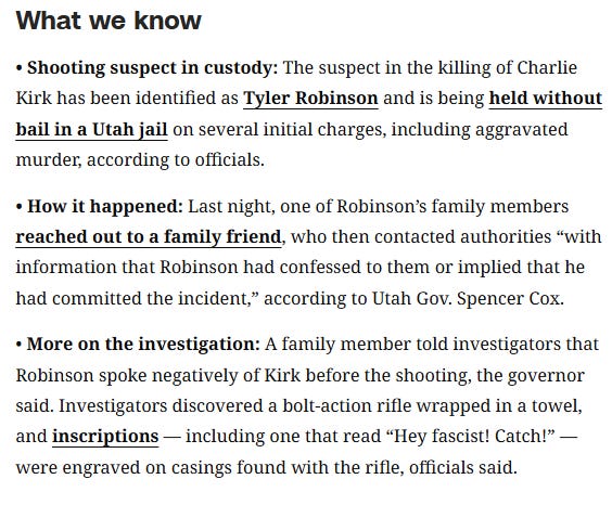 Woke up to some fabulous news this morning! The authorities have identified and arrested a suspect in Wednesday’s assassination of Charlie Kirk. 22-year-old Tyler Robinson is an electrical apprentice who lives a few hours from the Utah Valley University campus. (He was not a student there.)