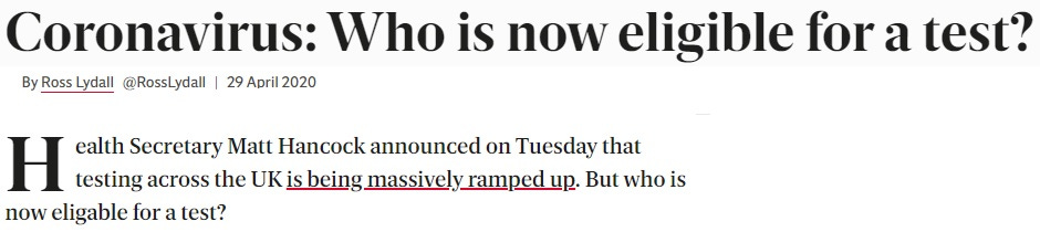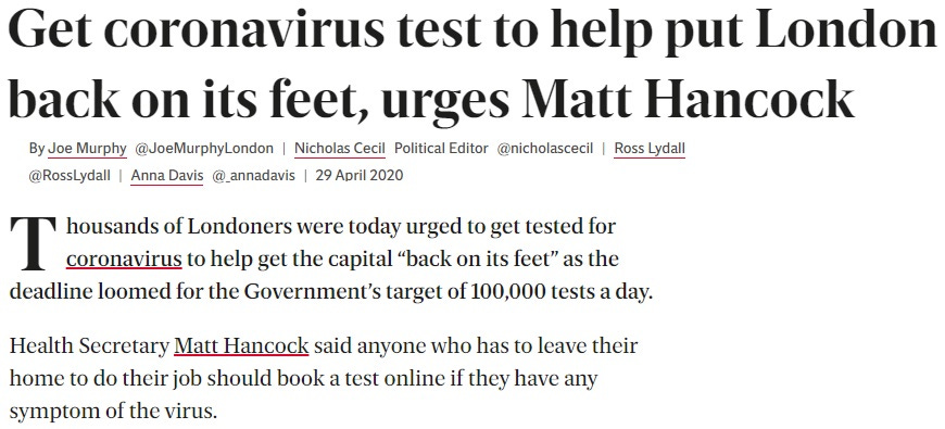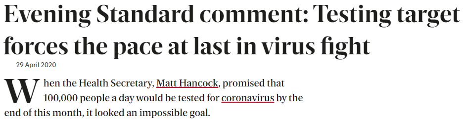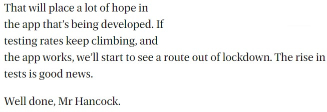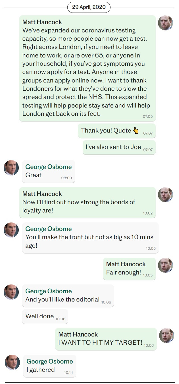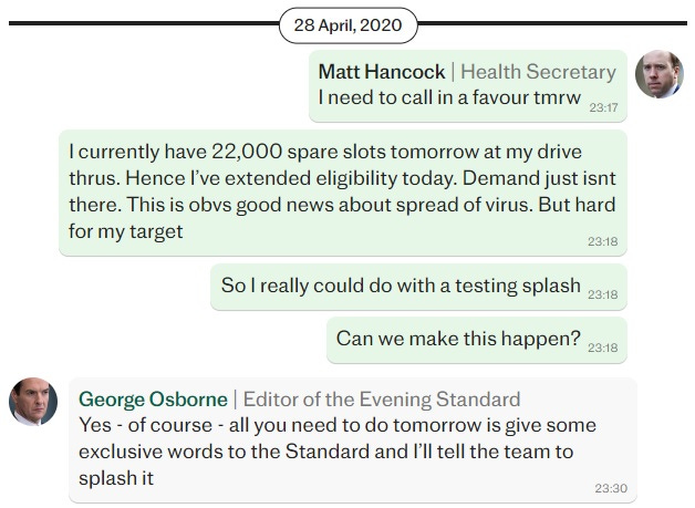 This conversation perfectly encapsulates the relationship between government and media. Osborne (and countless other media hacks) are only worried about how to make government happy. Osborne doesn’t even question why Hancock is so desperate to hit his arbitrary 100,000 testing mark or why demand for tests “just isn’t there”. “OF COURSE” he will do what Hancock asks — “Just write out whatever you want, we’ll be your parrot!” (Of course, Hancock already knows this — that’s why he asked in the first place.)