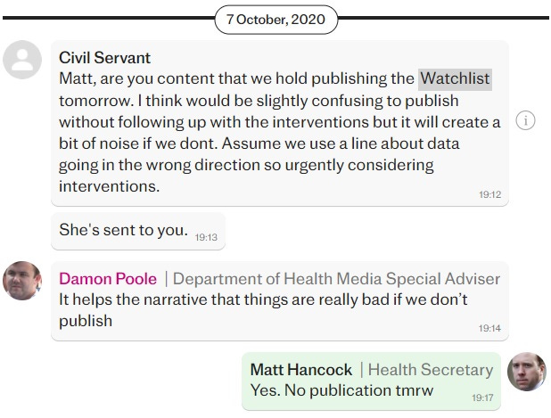 Other messages with Poole highlight the same “politics-first” thinking. Here, Hancock and Poole discuss publishing an update to the “Watchlist”, which was the UK’s way of tracking and classifying which zones had to live under which lockdown rules.