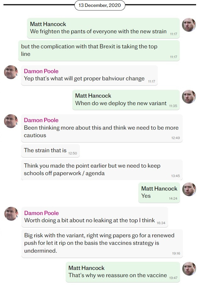 The next chapter of the Lockdown Files shows more of the same. We’ll start with perhaps the most circulated conversation first, in which Hancock is chatting with Damon Poole, the Department of Health's media advisor, about how they need to “frighten the pants [off] of everyone with the new strain”. (Interestingly enough, Hancock also ran to Poole when news of his affair was breaking as well.)