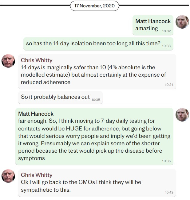 We get another example of this thinking from Hancock’s November 17th conversation with Chris Witty — England's Chief Medical Officer. When it turns out the UK’s 14-day “isolation” period was far too long, Hancock’s main concern is that people will think the ‘experts’ have just been making shit up the entire time. (He was worried people would think that because they were, in fact, just making shit up the entire time.)