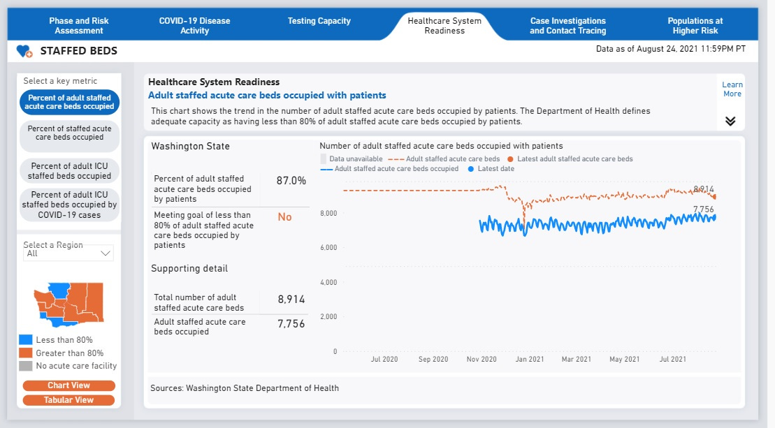 The most obvious metric of success. How busy are our hospitals? Turns out, not very busy at all. The first picture is the last day of data at this goalpost station. Our total occupancy hovered between 55-60% during the entire year. This is nearly empty as it pertains to regular hospital occupancy.