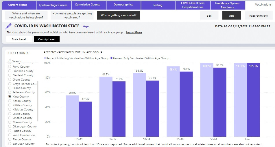 As more people become fully vaccinated, the size of the unvaccinated population in some demographic and geographic groups begins to approach zero. In some King County zip codes and subgroups of King County residents, due to imprecision in official King County population estimates, we are observing more vaccinated individuals than the total population.