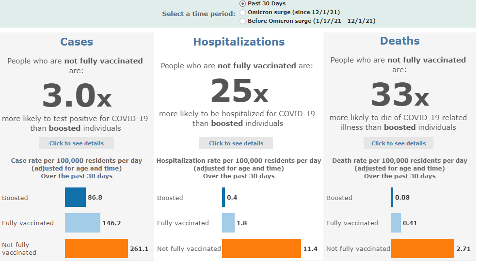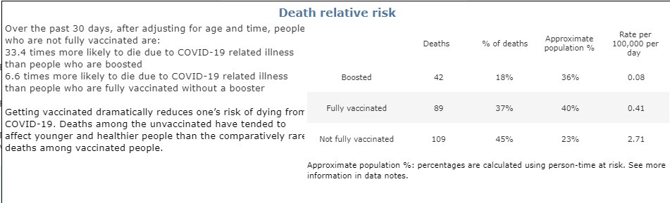 The data (the only actual data on the page!) shows vaccinated people make up 55% of deaths, and that ‘30x’ protection we saw above has dropped to 6.6x. Yet with another round of data ‘adjusting’ and moving the goalposts (again), the county makes it seem as if the vaccines are working.