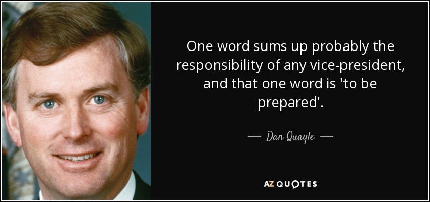 I confess to all assembled that Kamala Harris has made me think of poor Dan Quayle with much less scorn.
