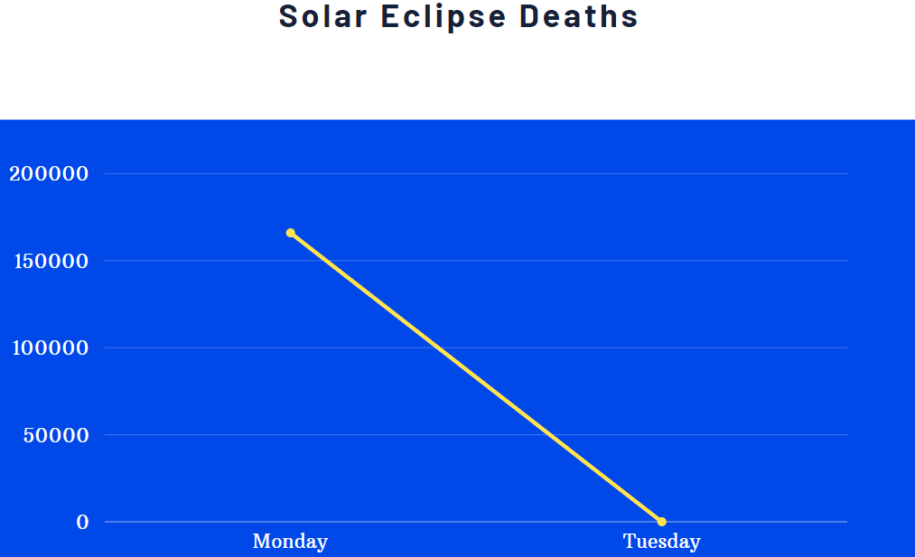 A mind-blowing estimated 166,000 people died on Monday — that’s over 55 September 11ths! Loving grandmothers who will never see their grandchildren again. Hard-working parents struggling to put food on the table. Precious little children — our most valuable resource — DEAD. Heart attacks, cancer, lightning strikes — the eclipse doesn’t care how it kills.