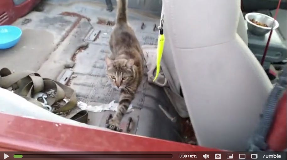 For weeks I’ve been trying to get a new video of Bonnie, the stray who spends some of her time out in the Jeep out back. She seemingly knew every time I’d take my phone out to get a video, because she was always nowhere to be seen!