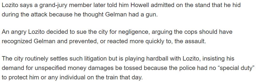 These are the facts in Lozito v. New York. Early in 2011, Maksim Gelman boarded a subway having already killed four people in a 28-hour murder spree. Police officers Terrance Howell and Tamara Taylor were stationed in the operator’s cab SPECIFICALLY LOOKING for Gelman — who at one point demanded to be allowed into that very operator’s cab, with Gelman stating that he was a police officer. (This didn’t raise the suspicions of the actual cops Gelman was interacting with.)