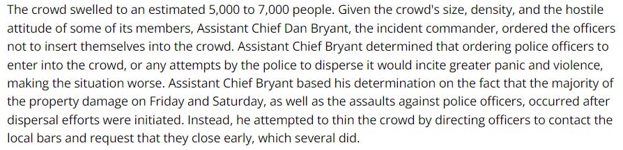 Obviously a little bit miffed about the experience (and with considerable hospital bills), my friend explained to me that a handful of people who suffered injuries — including Chris Shirley, it turns out — sued the city for not intervening in the riot. And what he said next blew my already-wasted mind: They lost the case because the police have no duty to protect you. (At the time, they were appealing the decision, but they also lost there.)