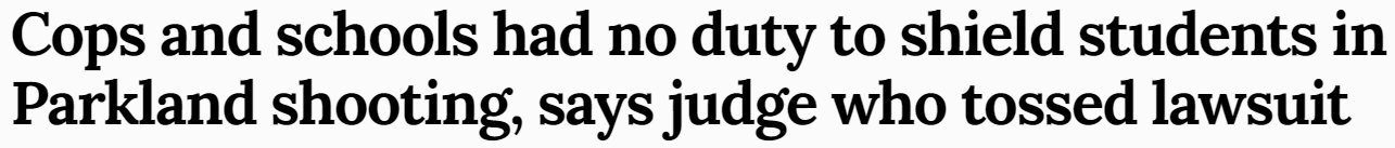 Four minutes and 17 bodies later, Cruz stopped his assault, blended in with the panicking crowd, and left campus. Peterson hid for 45 minutes. By now you shouldn’t be surprised at what happened in the subsequent lawsuit filed by 15 students:
