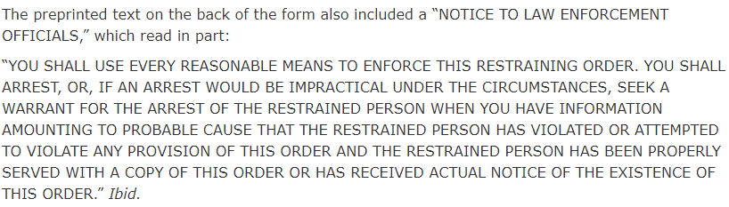 So what DOES count as a “special relationship” with the police that requires them to come to your aid? What about a restraining order — say, against your psychotic estranged husband? What if that restraining order specifically stated that police SHALL arrest the offending party?