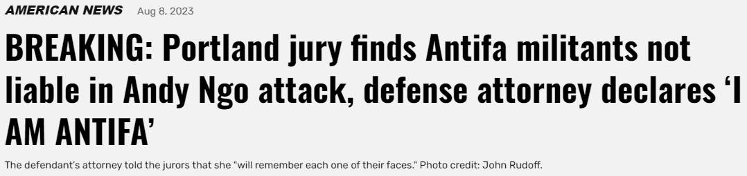What the Portland Mercury doesn’t mention is that the judge was concerned about Antifa members doxxing members of the jury in order to uncover their identities. Also missing from the story is that the defense attorney — conveniently retiring Michelle Burrows — told the jury that she "will remember each one of their faces" after earlier declaring “I am Antifa”.