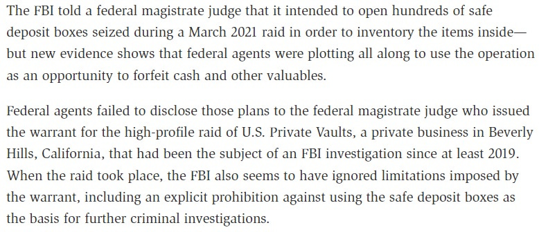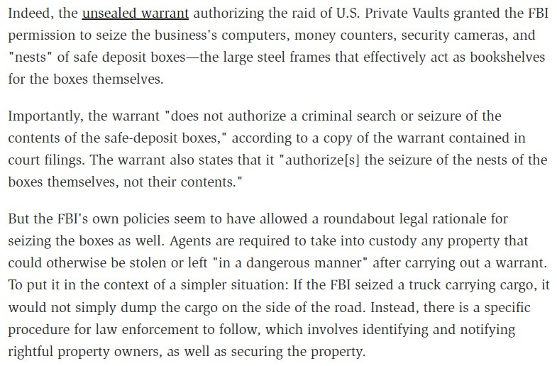 But somehow the story gets EVEN WORSE. Now that the FBI has taken the boxes, it claims agents are going to ‘inventory’ them — but internal communications have revealed that the FBI ALWAYS planned on stealing the contents of the boxes. (Shout out to Reason, which has been on this story from the jump)