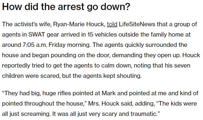 Long-time readers will know I’m not a huge fan of the FBI, especially the way they’re being run these days. But sometimes even I’m surprised about the depths to which these people will sink. We’ll start with a basic 25-agent raid of a pro-life activist who — according to his lawyer — said he would cooperate months ago.