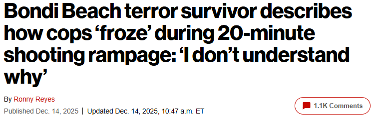 Sadly, we got another example of this THE NEXT DAY in Australia, as father and son Sajid Akram, 50, and Naveed Akram, 24 killed 15 people and wounded dozens more when they opened fire on a Jewish festival at Bondi Beach.
