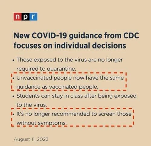 The CDC quietly changed its recommendations, and now vaccinated and unvaccinated people are treated exactly the same. Oh, and if you don’t have symptoms you don’t need to worry.