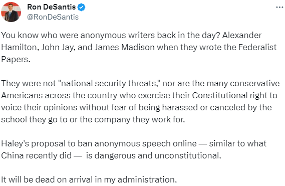While I agree with DeSantis overall on this, these three men certainly WERE considered “national security threats” by the nation still at war with our fledgling association of states. Were the British authorities able, they certainly would have demanded the identity of “Publius” and thrown all three men into prison for the rest of their lives. (Nikki Haley would have gleefully led the charge.)