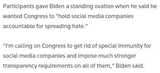 Apologies for the second e-mail in one day, but this was too big to simply lump in with the last piece. Yesterday Joe Biden reiterated his support for the removal of “social media immunity” with regards to “hate speech”.