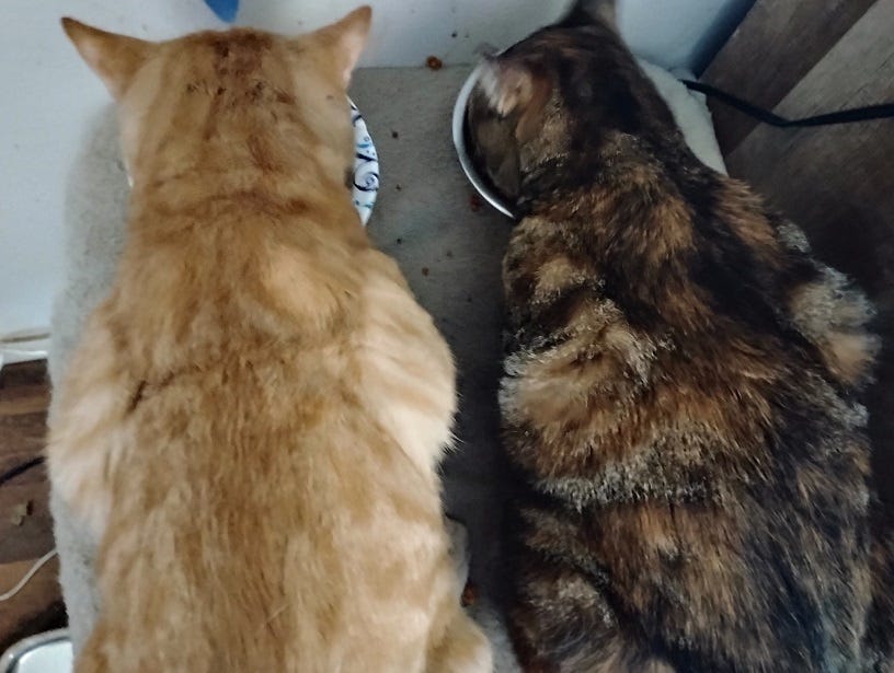 Straightening the cats didn’t work, so I swapped the bowls. Everybody was happy.