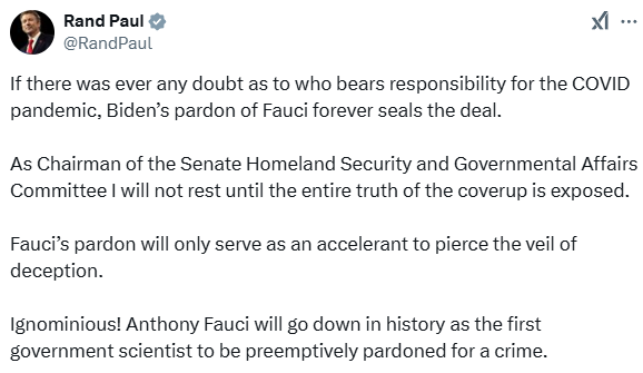 Along those lines, Biden’s recent pardon of Fauci was a tough pill to swallow, but we should continue to press for the truth about covid — and who knew what when. After all, it was EXTREMELY unlikely that Fauci was ever going to serve any time behind bars — and it’s much more important that the public understand the full extent of the covid deception. Luckily, Rand Paul is still on the case: