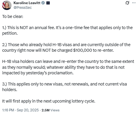 And at the signing ceremony, Secretary of Commerce Howard Lutnick explained that the new fee was $100,000 per year (of course on top of actually paying the employee), so replacing a ‘regular’ employee with an H-1B visa recipient no longer makes economic sense.