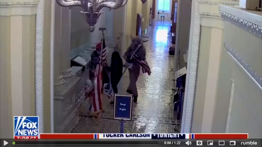 In the clip, Carlson explains how Capitol Police never once attempted to stop “shaman” Jacob Chansley. Quite the opposite — police acted as “tour guides”, attempting to open locked doors and allow Chansley into the Senate chamber.