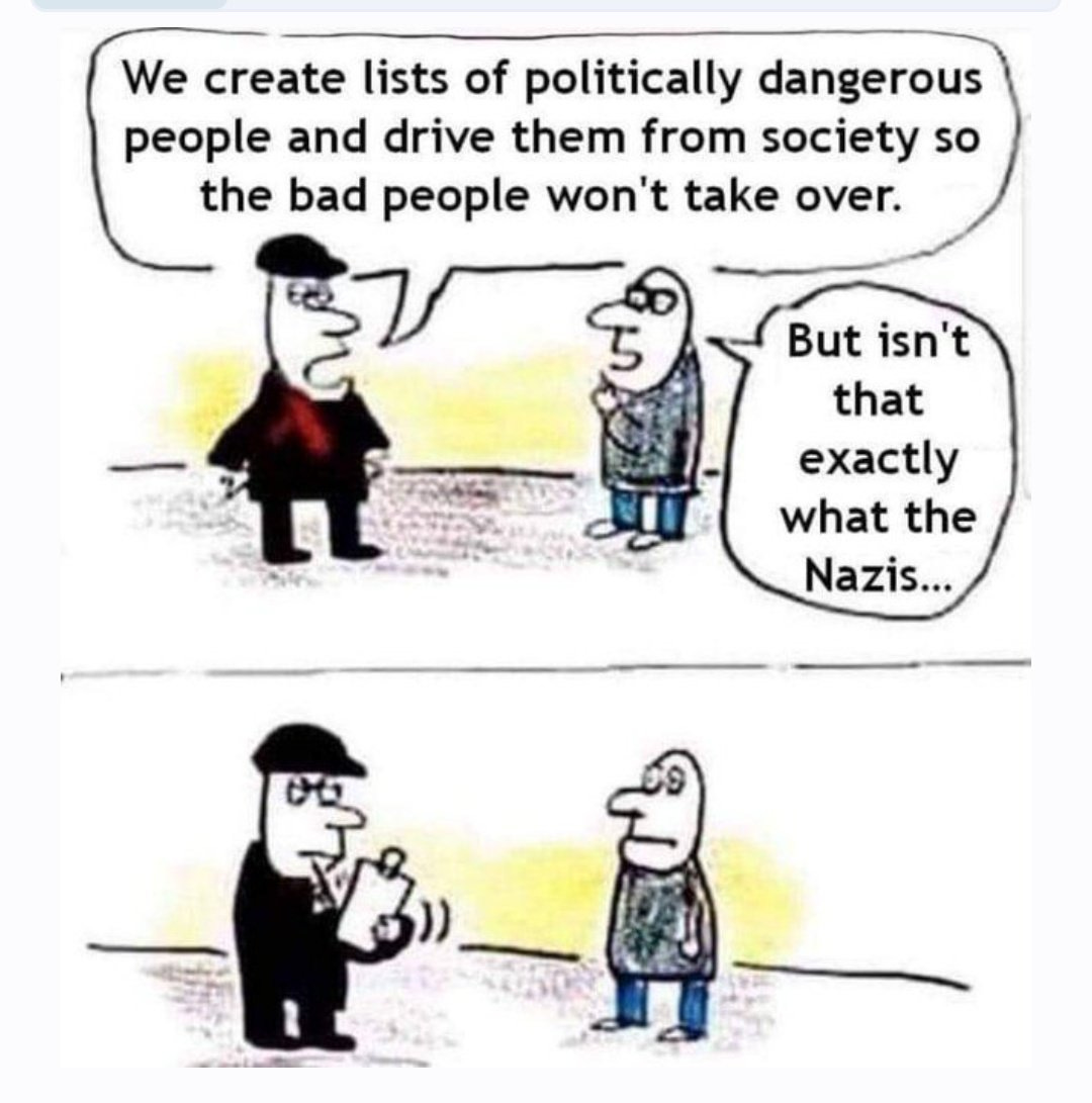 See guys? De-platforming works! When you’re in office, you just make a list of your political enemies, then work with the media complex (including many ex-government employees) and get them kicked out of society! To defeat fascism, of course.