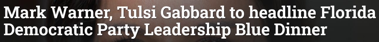 It’s not lost on me that Senator Warner’s attacking Tulsi for actions taken when she was a Democrat. So I was curious….did he say anything about Gabbard’s actions at the time? I cranked up the Magic Time Machine and set search parameters between 2012 and 2020. Here’s the only article in which both Warner and Gabbard appear: