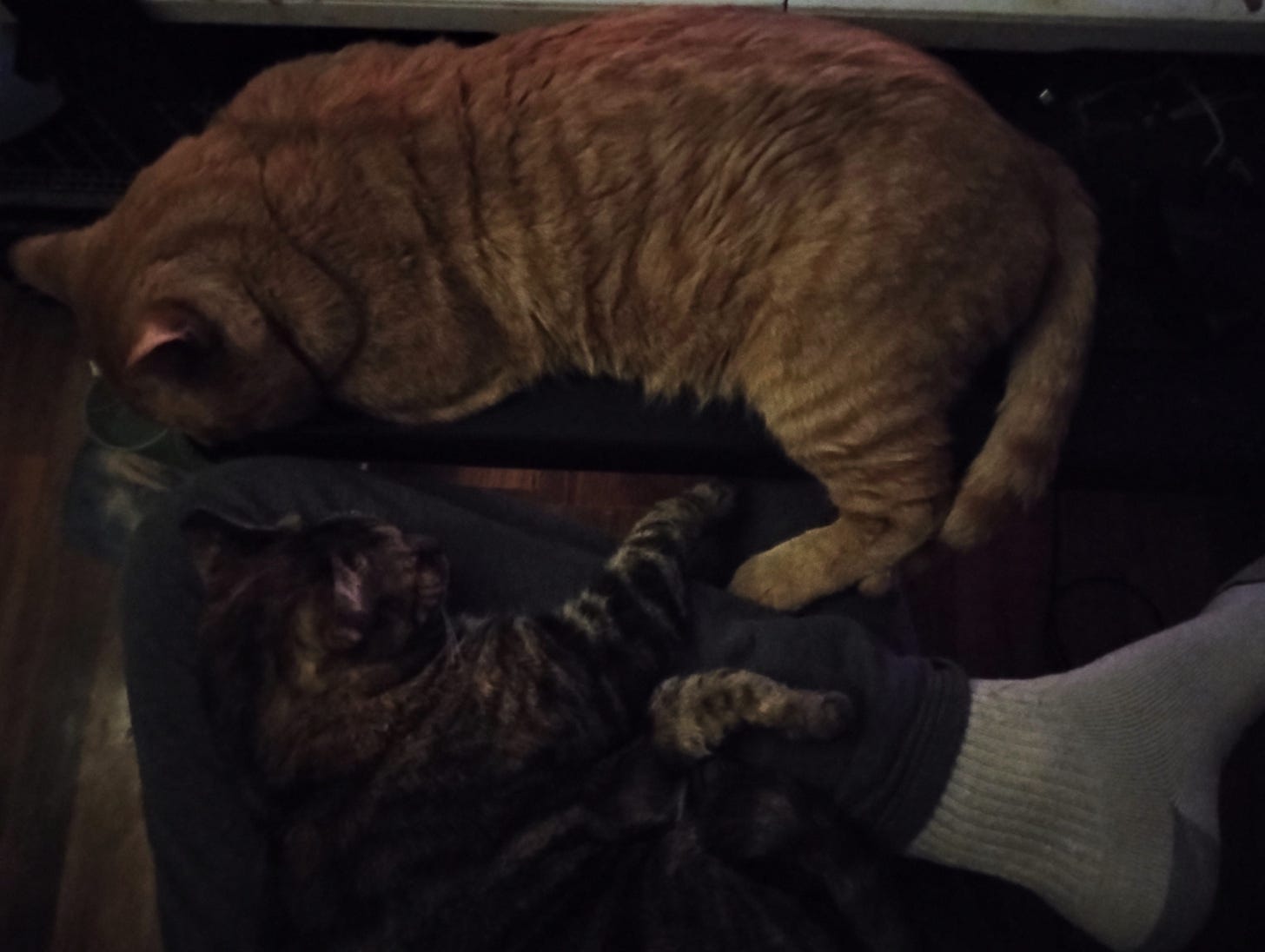 Finally, it looks like I have JUST enough room to add this recent picture of G & B — when the catboard tray was occupied, Bonnie chose to nap in the next-best spot: