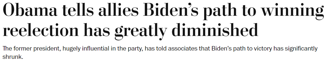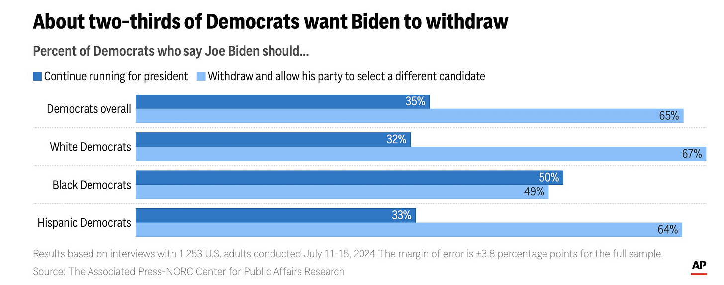 This is a huge problem because the party very publicly stonewalled its way through the entire primary process — refusing to expose Biden to debates with RFK and others, during which his condition may have been revealed. Voters feel (rightly so) that they’ve been left out of the entire primary process — which makes it hard to rile them up about ‘the end of Democracy’.