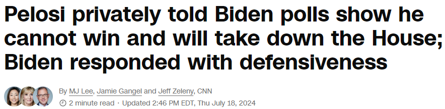 “If you take that message [the money drying up] and combine it with the orchestrated message, really collectively, of the leadership of the Congressional Democrats — that is as dark a day as there has been for Joe Biden since the debate, where it is now sort of clear that collectively the leadership of the party in the Senate and House and the donors who support Joe Biden and the Democratic party are basically sending a very clear message to Joe Biden about what they think is in the best interest of the party.”