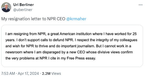 In the least surprising plot twist of the year, Uri Berliner has resigned from National Public Radio after the company suspended him last week for his Substack post detailing NPR’s political bias and the problems it causes: