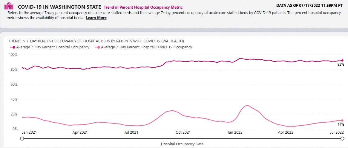 Interestingly, the chart here only goes back to 2021, not all the way through the pandemic. But view the two years’ information together with multiple screenshots, and it’s clear that Washington state never experienced any type of increase in hospital utilization the entire ‘crisis’. No matter how many covid-positive patients were in the hospital, total utilization remained flat. (Inslee’s stupid mandate excepted) This suggests that covid patients were in the hospital for other reasons — perhaps even catching the virus while they were there — or were unhealthy enough that they would have been in the hospital for something else if they were not there for covid. (In effect, not taking up a ‘new’ bed)