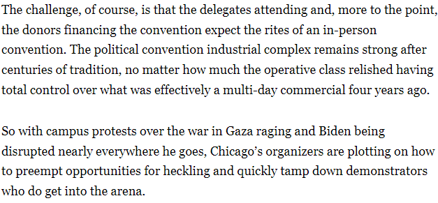 Now Biden has pissed off supporters on BOTH sides of this war, and is facing nationwide protests on college campuses — just as election season is getting into full swing. This worries high-ranking members of the DNC, who are quietly trying to minimize the “Chicago” in this year’s nomination process:
